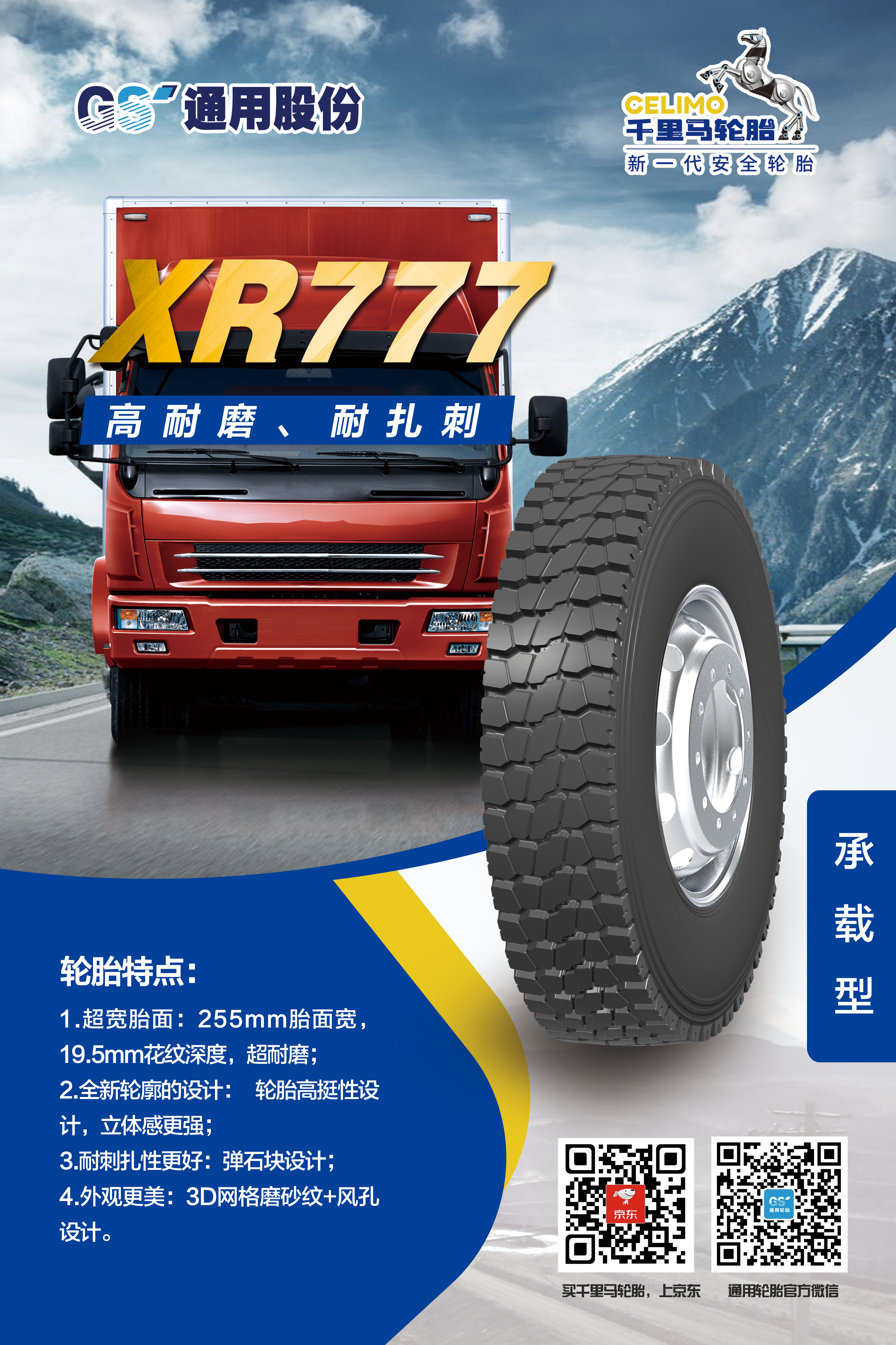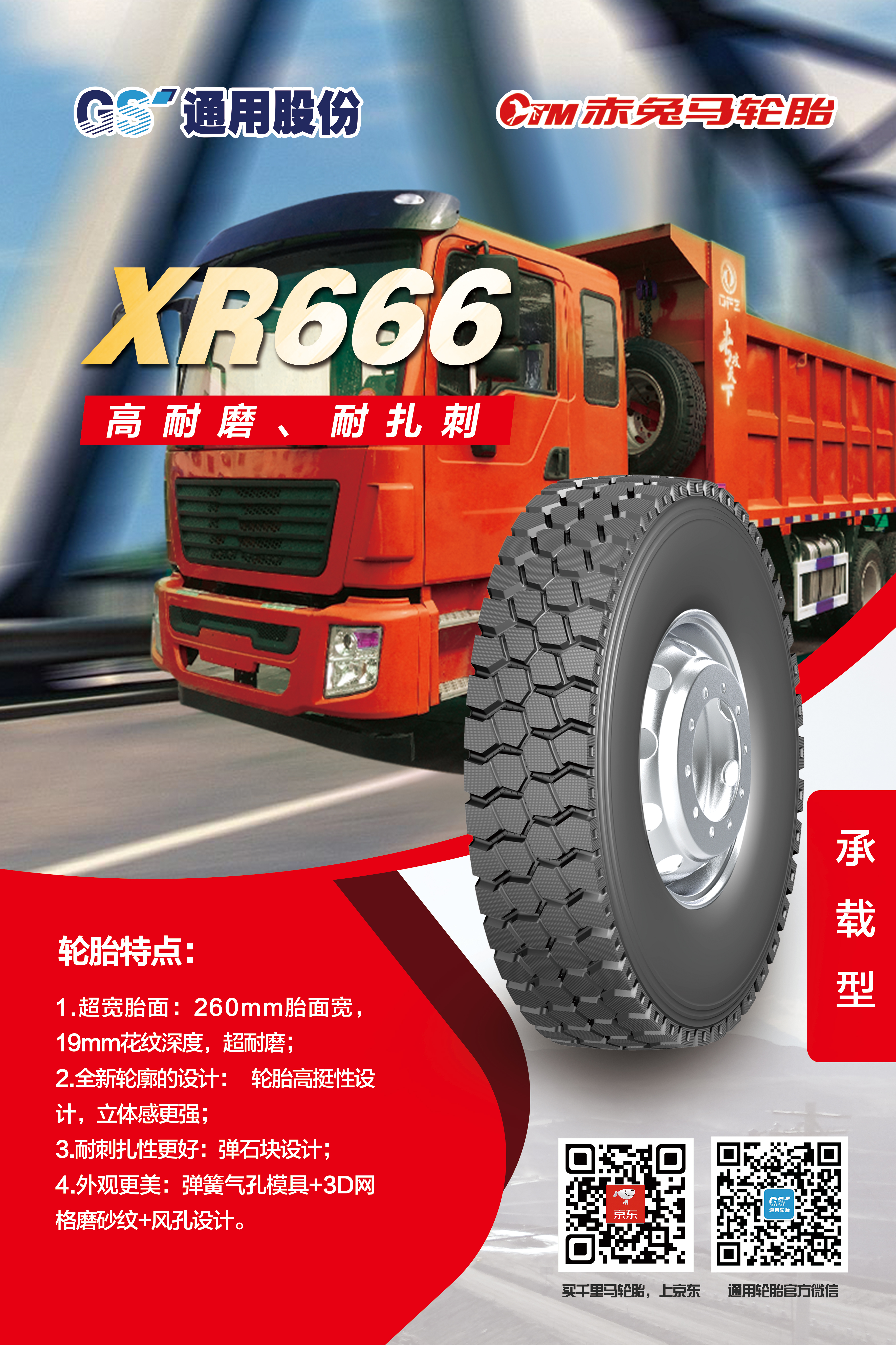 為適應不斷變化的市場環境,滿足消費者對輪胎性能的更高需求,通用股份以創新為突破口,應用新進技術,在承載能力上實現突破,推出兩款專為中短途運輸車輛量身打造的承載新品——XR666、XR777。