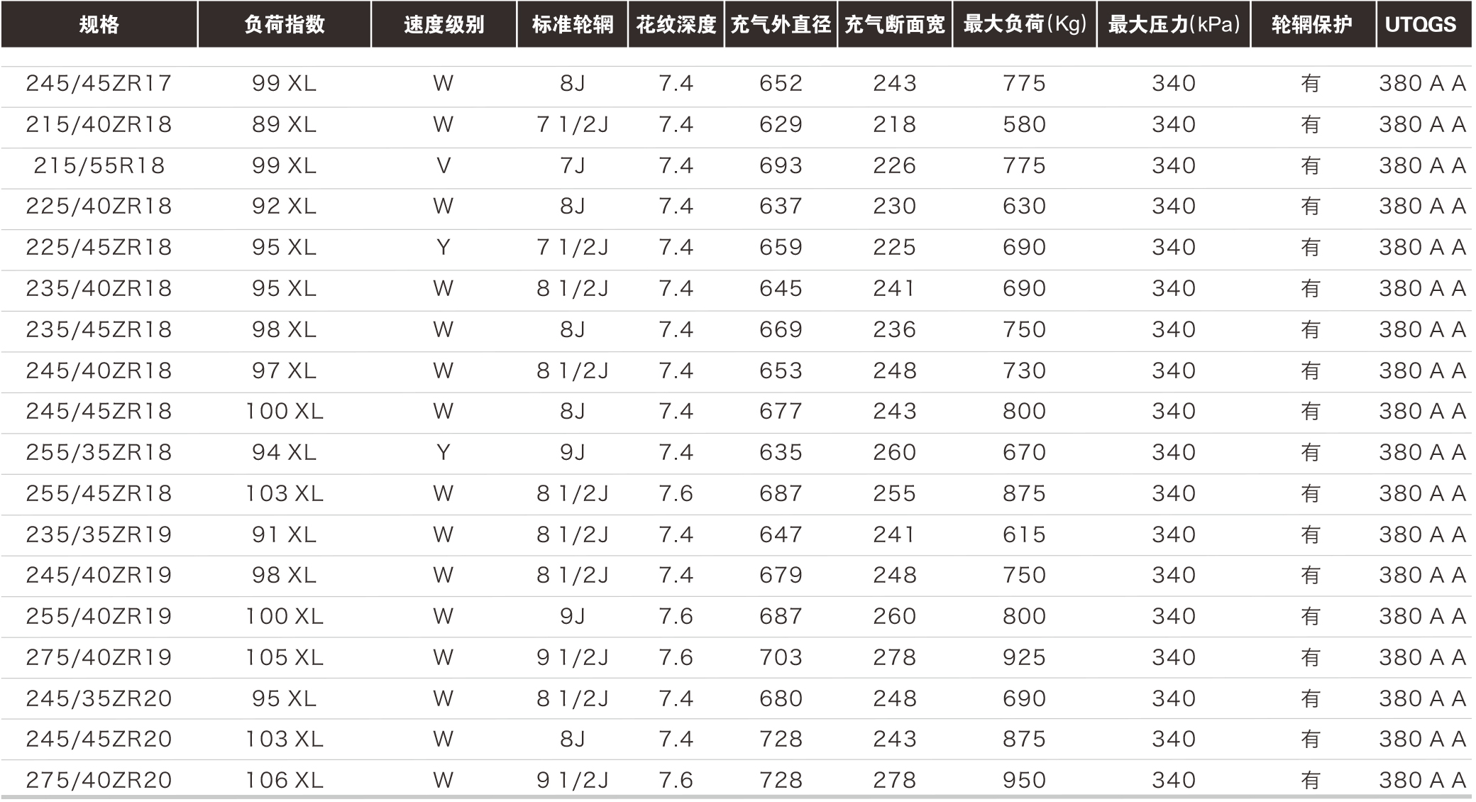 細溝槽搭配橫向連貫的橫向溝槽,有效切破水膜,提升濕地性能;獨特的胎面配方設計,保證優異的干濕地操控性能。